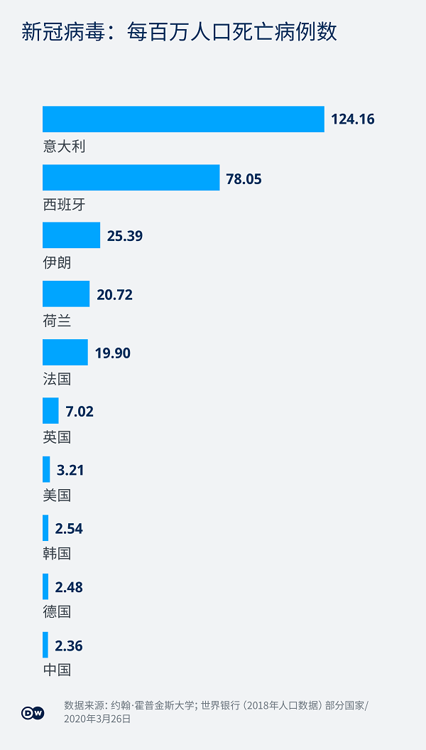 3月22日,德國總理默克爾則由于其醫(yī)生感染了新冠病毒開始自我隔離。3月26日,德國確診人數(shù)超過39500人,死亡222人。但相對來講,此時意大利確診人數(shù)約為75000人,卻有超過7500人死亡,西班牙確診病例在56000以上,死亡接近4100人。