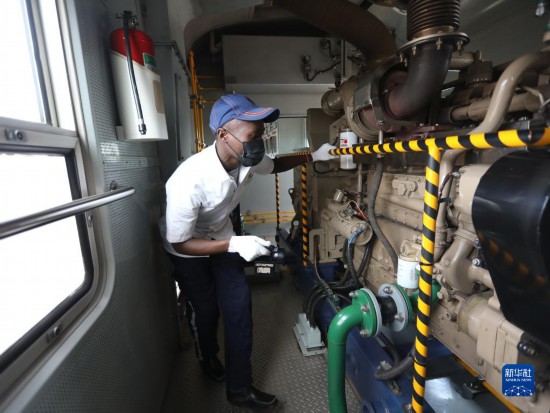 7月29日,發(fā)電車乘務員福斯汀在肯尼亞蒙內(nèi)鐵路客運列車上檢查設備。
