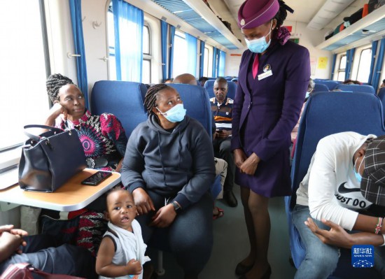7月29日,列車員菲奧娜(站立者)在蒙內(nèi)鐵路客運(yùn)列車上與乘客交流。