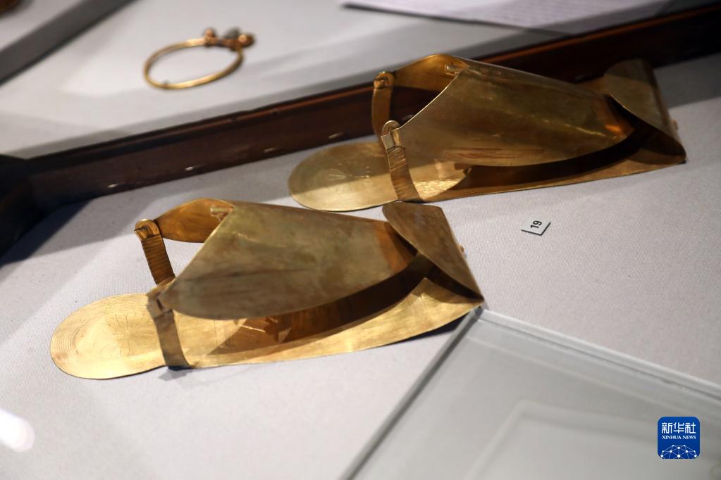 這是10月3日在位于埃及開羅的埃及博物館拍攝的法老蘇瑟奈斯一世的一雙金質(zhì)鞋。 新華社發(fā)(艾哈邁德·戈馬攝)