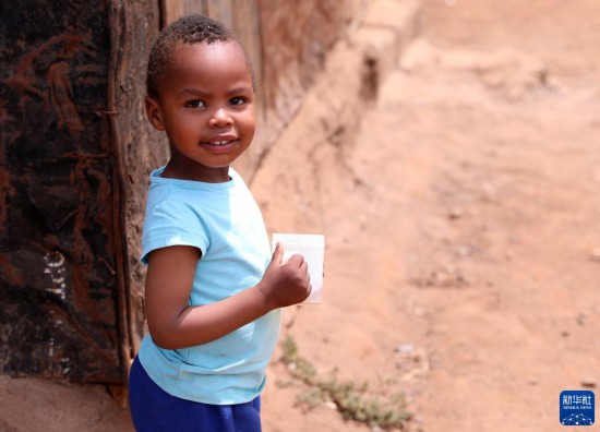 11月10日,一個孩子手握水杯站在肯尼亞基姆卡的一座幼兒園內(nèi)。