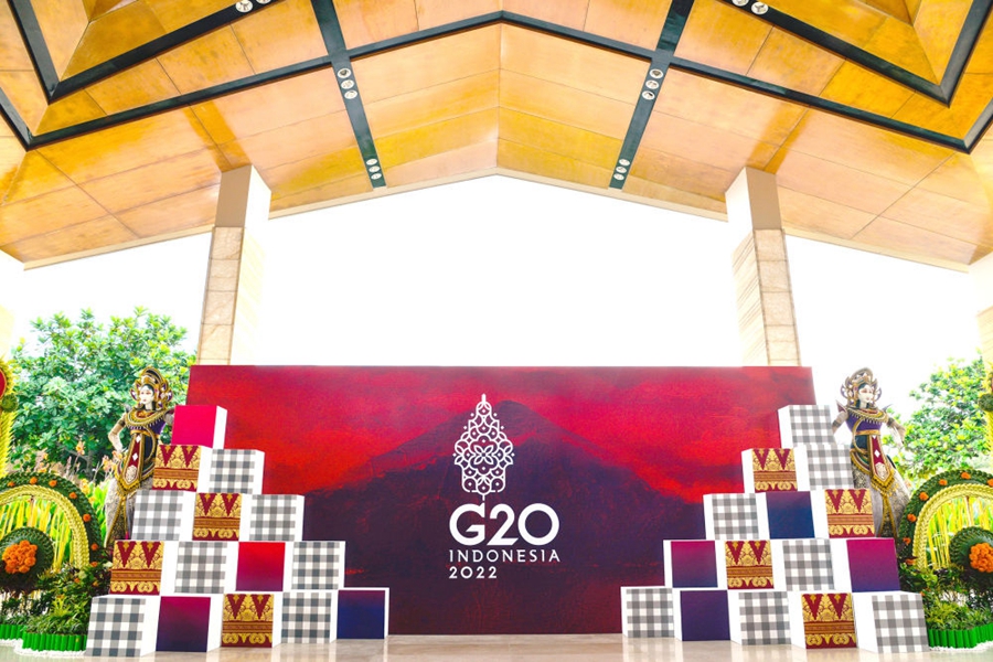 這是2022年11月11日在印度尼西亞巴厘島二十國集團(tuán)領(lǐng)導(dǎo)人第十七次峰會一處會場外拍攝的峰會標(biāo)識和裝飾。新華社記者 徐欽 攝