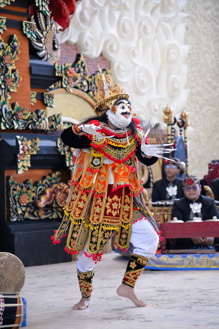 2022年7月10日,舞者在印度尼西亞巴厘島一處文化公園表演傳統(tǒng)舞蹈面具舞。新華社記者 徐欽 攝