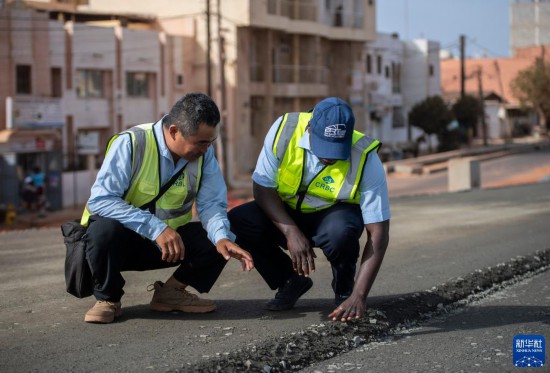 5月13日,在塞內(nèi)加爾達(dá)喀爾快速公交項(xiàng)目建設(shè)工地,蘇信(右)檢查工程質(zhì)量。新華社記者 李亞輝 攝