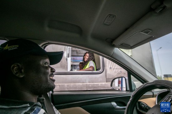 5月13日,蘇信開車經(jīng)過塞內(nèi)加爾捷斯-圖巴高速公路捷斯收費(fèi)站時(shí),與妻子莫妮克短暫交流。新華社記者 李亞輝 攝