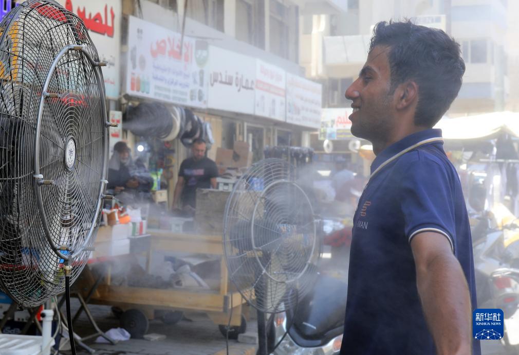 7月18日,在伊拉克巴格達(dá),一名男子在街頭吹電扇降溫。