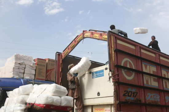 8月24日,在阿富汗首都喀布爾,工人向貨車內裝載貨物。新華社發(fā)(塞夫拉赫曼·薩菲攝)