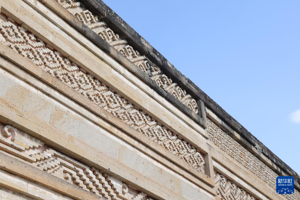 這是9月17日在墨西哥瓦哈卡州米特拉遺址拍攝的幾何石材拼嵌裝飾。