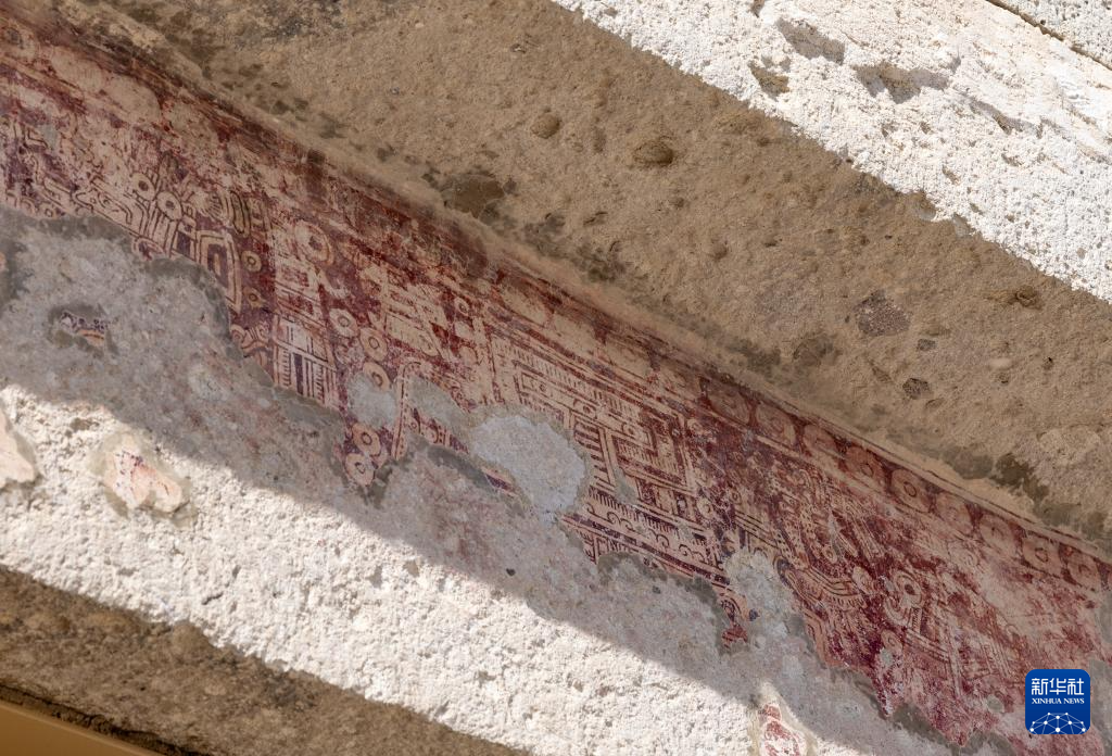 這是9月17日在墨西哥瓦哈卡州米特拉遺址拍攝的殘存的壁畫。